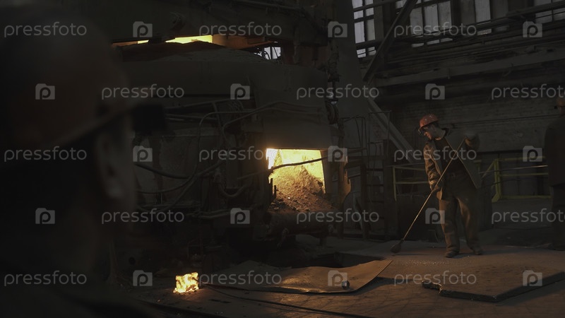 Рабочие, обрабатывающие расплавленный металл на литейной фабрике, демонстрируют промышленную активность, мастерство и командную работу