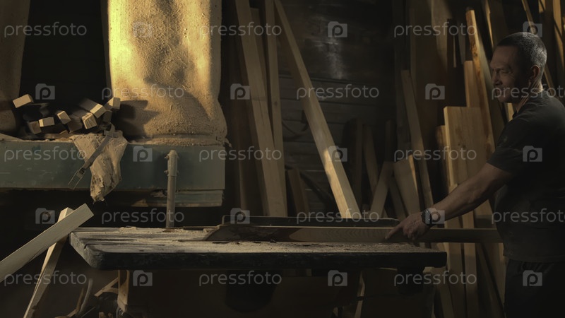 Рабочий с улыбкой, радостный ремесленник в освещенной мастерской тщательно направляет длинный кусок древесины через пилу