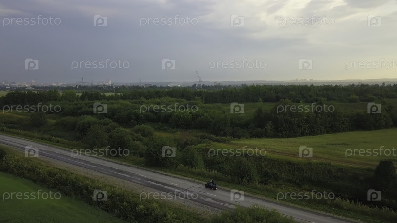 Аэрофотосъемка мотоциклиста, едущего по сельской дороге через зеленый пейзаж