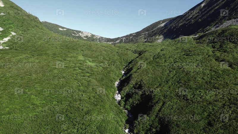 Вид с воздуха, летящий над горной долиной с рекой