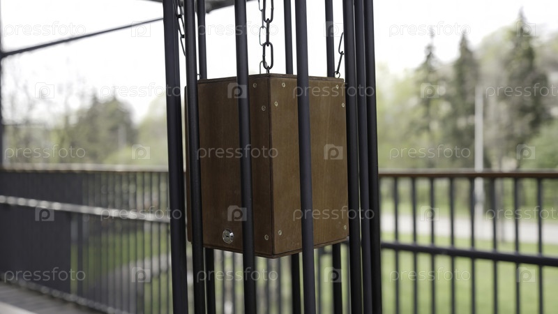 Загадочная деревянная коробка висит на металлическом заборе и клетке на балконе, смешивая природу с городскими элементами, вызывая любопытство