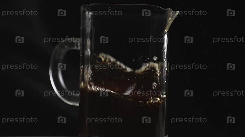 Стеклянный кувшин, заполненный завариваемым кофе, демонстрирующий богатые цвета и пузыри на темном фоне
