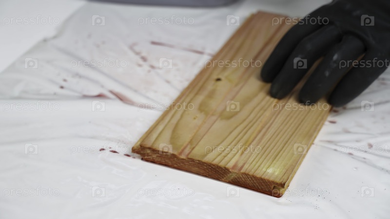 Клубовая фотография, на которой человек тщательно окрашивает деревянную доску щеткой