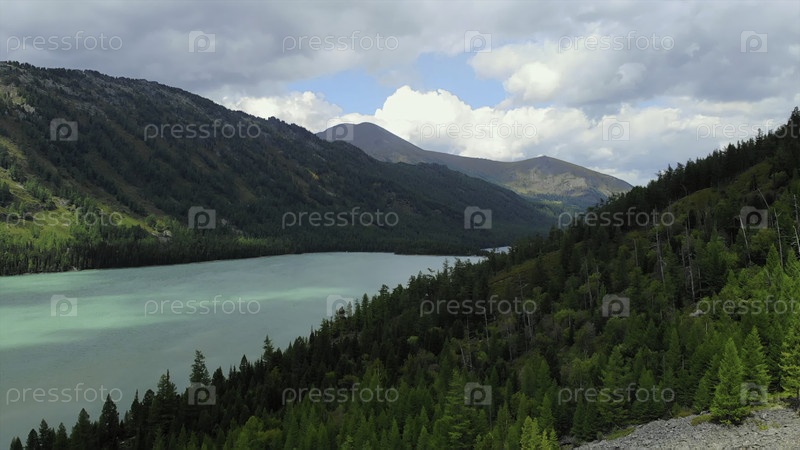 Вид с воздуха на альпийское бирюзовое озеро и лесистые горы