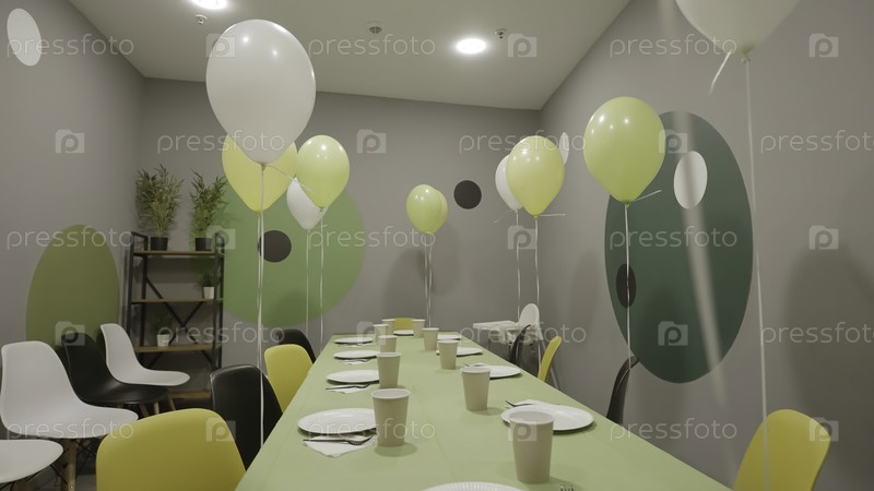 Веселая и оживленная сцена вечеринки с яркими зелеными и желтыми воздушными шарами рядом с красиво устроенным столом