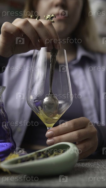 Спокойный момент приготовления успокаивающего травяного чая с использованием свежих ингредиентов, тщательно расположенных в стеклянном сосуде
