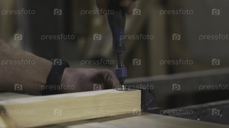 Детальный снимок сцены рабочего, обеспечивающего защиту деревянной панели с помощью отвертки в теплой освещенной мастерской