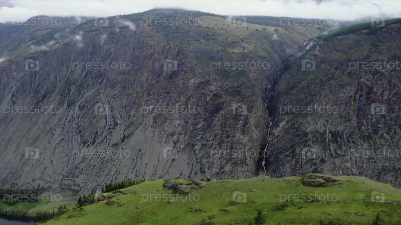 Водопад, каскадирующий вниз по скалистой склоне горы в долине Чулышман.СМИ