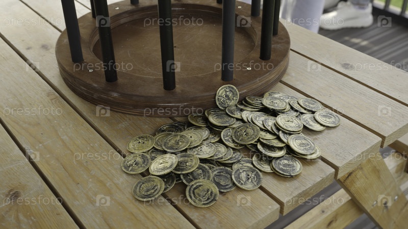 Это видео демонстрирует деревянный стол с кучей монет, создавая теплую атмосферу и подчеркивая их тактильную красоту среди древесных зерен