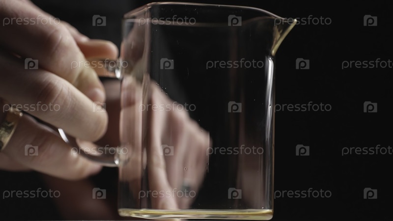 Очень подробное и крупное изображение руки, которая аккуратно поднимает стеклянную кружку с небольшим количеством жидкости