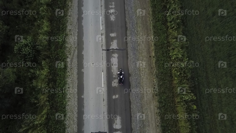 Мотоциклист, путешествующий по сельской асфальтированной дороге с воздуха