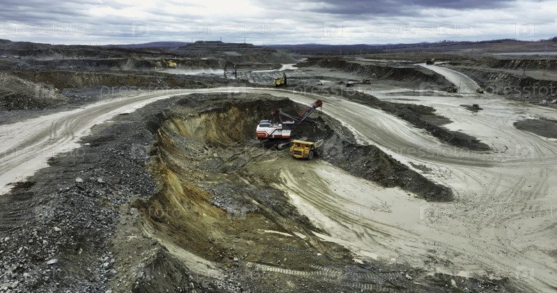 Экскаватор загружает сварочный грузовик в открытую шахту