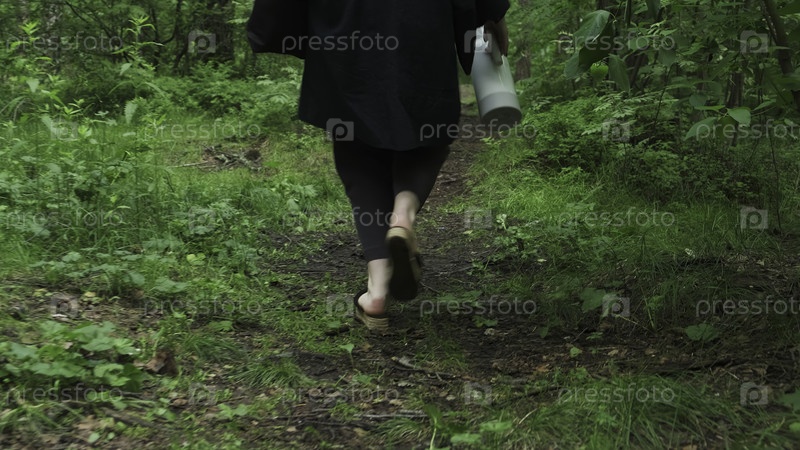 Человек гуляет по живому зеленому лесу, неся коврик для кемпинга и полностью охватывая красоту природы
