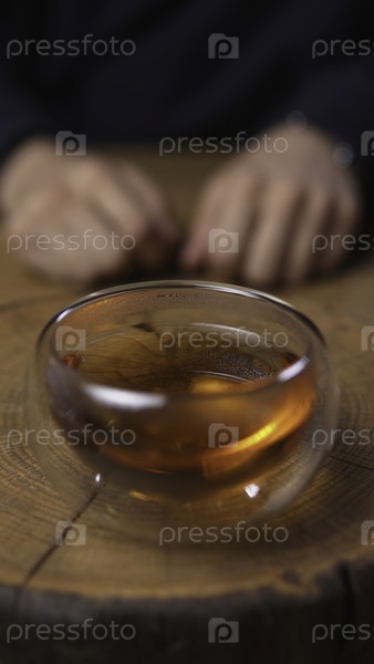 Близкий взгляд на ароматический травяной чай, красиво отображаемый в стеклянной таре и опирающийся на деревянный стол