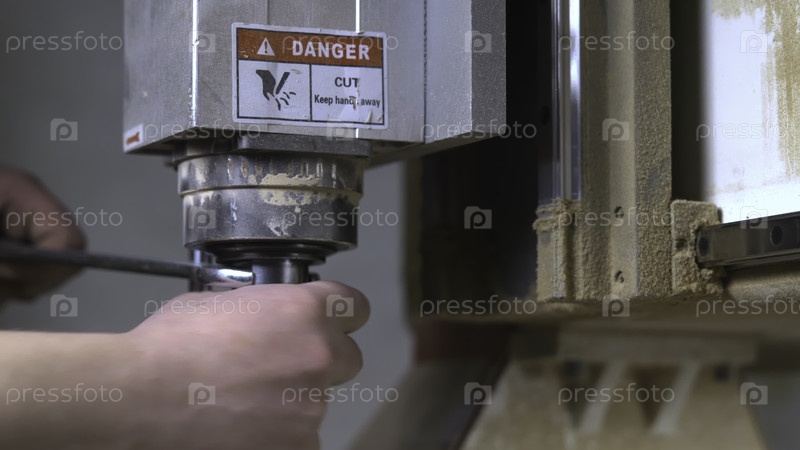 Фокусированный техник использует ключик, чтобы точно закрепить коллет шпинделя в пыльной среде мастерской
