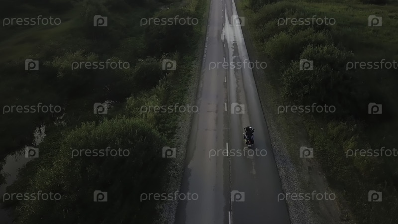 Аэрофотосъемка мотоциклиста, едущего по влажной сельской дороге