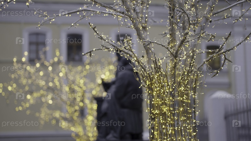Золотые рождественские огни мерцают на ветвях городских деревьев