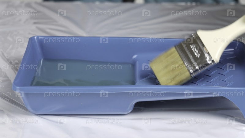 Кисть погружается в темную краску, которая находится в синей лотке, полностью подготовленной к нанесению