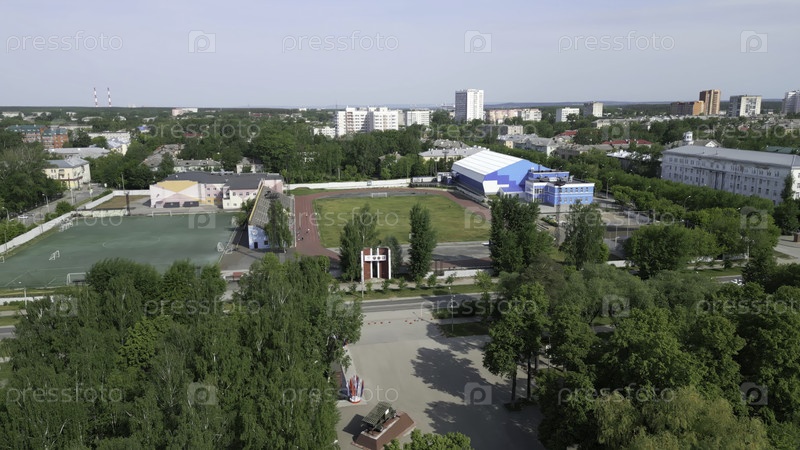 Стадион и спортивные поля в российском городе в солнечный день