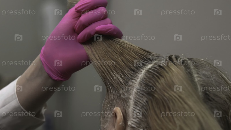 Профессиональный стилист тщательно разделяет и готовит блондинки для выделения в безмятежных условиях салона