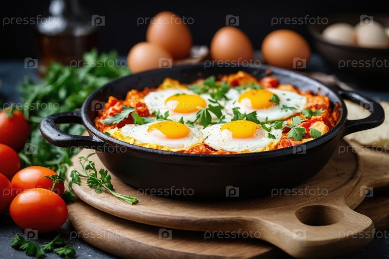 AI Generative Shakshuka with scrambled fried eggs, сердечная вкусная традиционная кулинарная бранчевая кухня