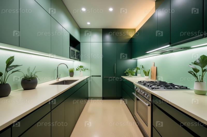 AI Generative Современный стильный модный кухонный интерьер с зеленой мебелью и предметами домашнего обихода