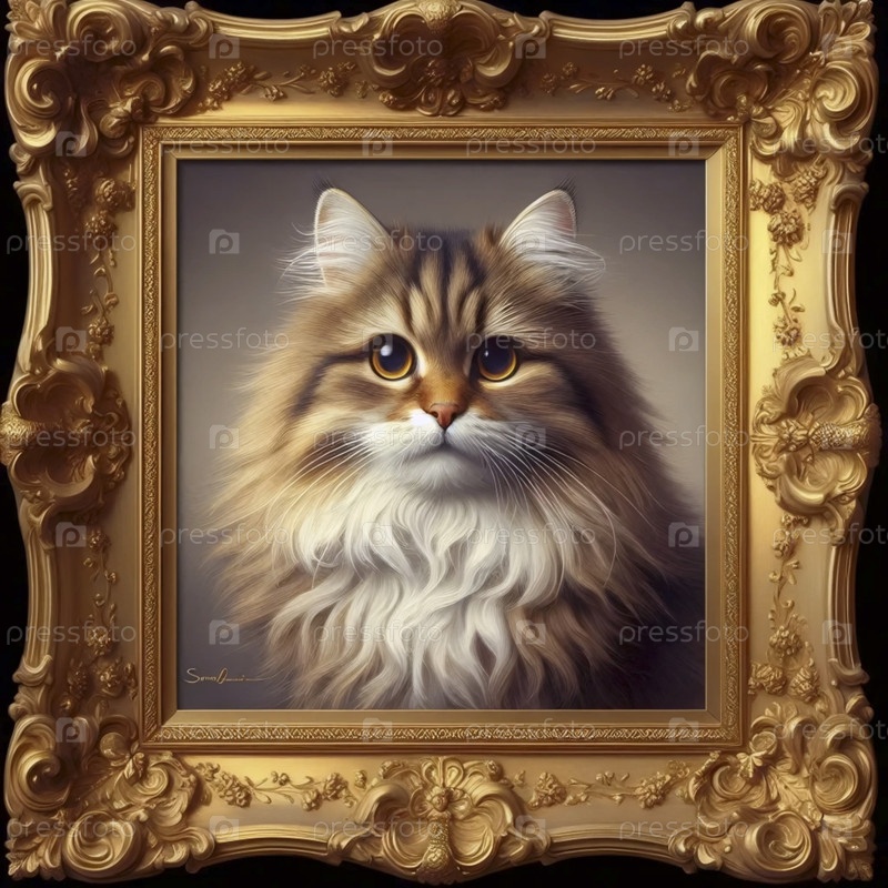 Небольшой портрет кота с золотой рамкой, масляная живопись, Ai generated image
