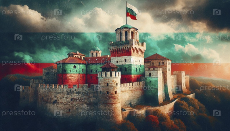 Болгарский флаг в архитектуре средневековой крепости, Ai generated image