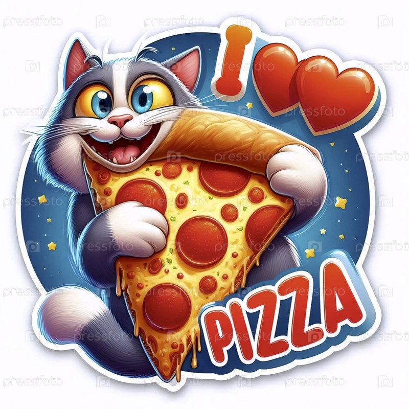 Счастливый кот обнимает кусочек пиццы Наклейка на фрагмент пиццы, Ai generated image