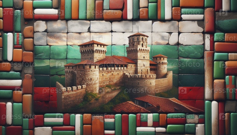 Болгарский флаг в архитектуре средневековой крепости, Ai generated image