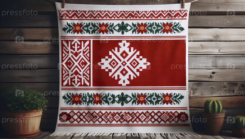 Белорусский флаг в народном текстильном орнаменте rushnik, Ai generated image
