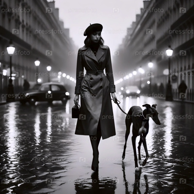 Женщина с собакой на дождливой улице, Ai generated image