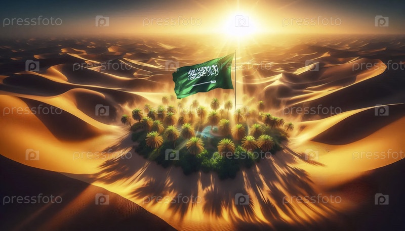 Саудовский флаг в пустынном оазисе пейзаж, Ai generated image