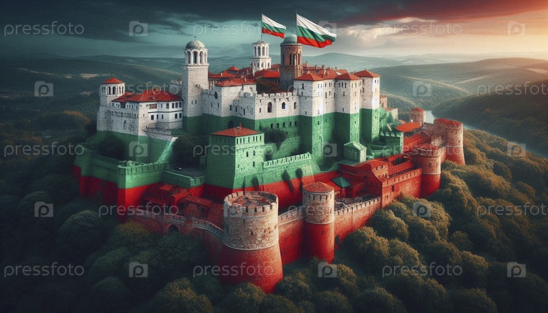 Болгарский флаг в архитектуре средневековой крепости, Ai generated image