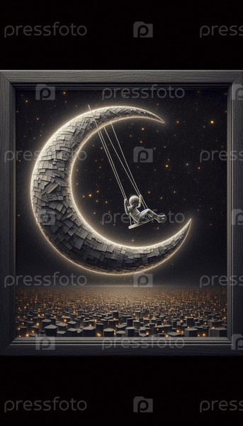 Ребенок, качающийся на полумесяце над городом, Ai generated image