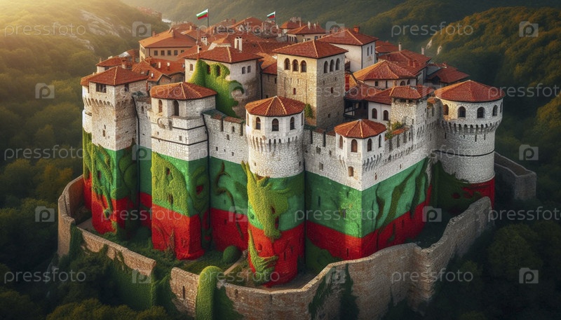 Болгарский флаг в архитектуре средневековой крепости, Ai generated image