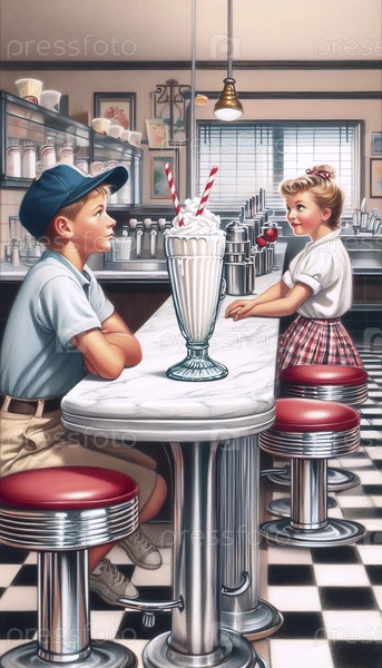 Ретро-постер двух детей, делящихся молочным коктейлем, Ai generated image
