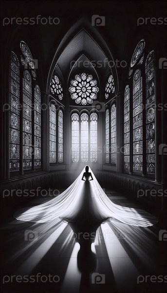 Винтажный силуэт невесты на окнах собора, Ai generated image