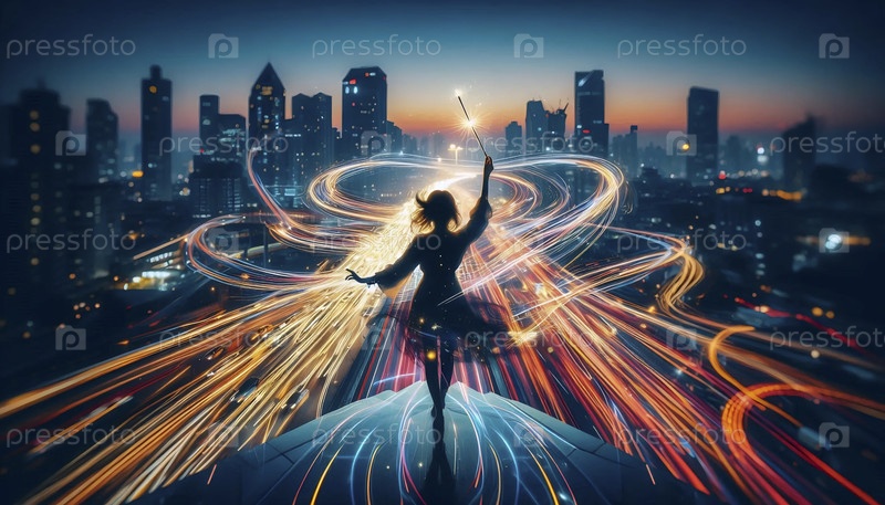 Девушка дирижирует симфонией городских огней с помощью искры, Ai generated image