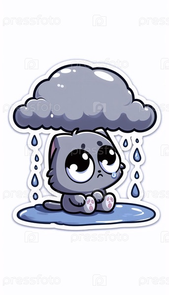 Печальный кот под наклейкой дождевых облаков, Ai generated image