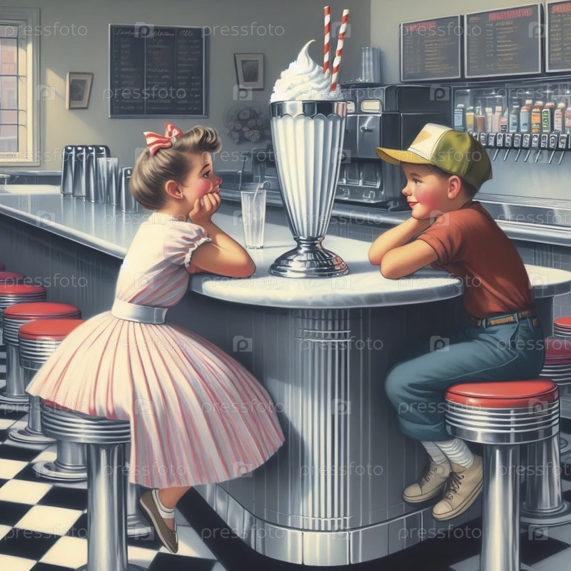 Ретро-постер двух детей, делящихся молочным коктейлем, Ai generated image
