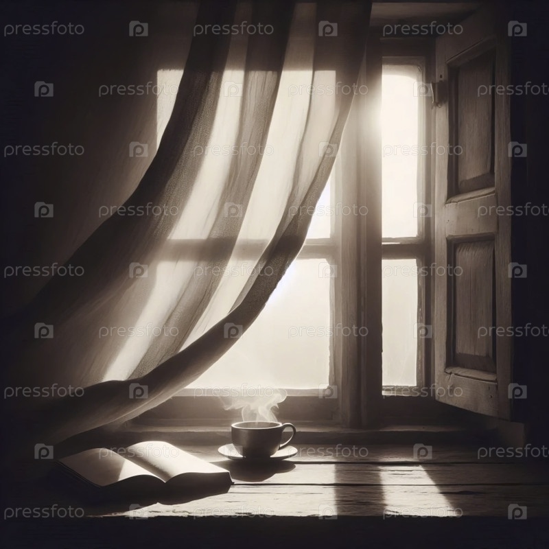 Пустое окно с чашкой кофе на рассвете, Ai generated image