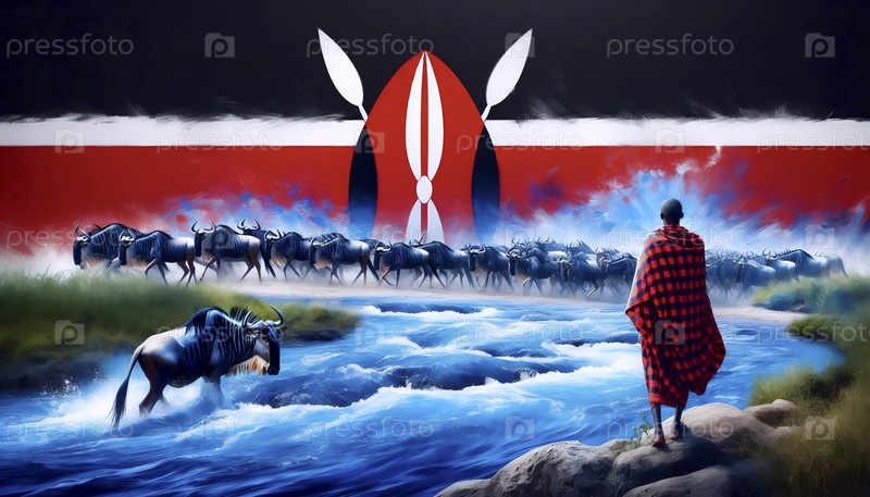 Флаг Кении в Масае Мара Великая миграция, Ai generated image
