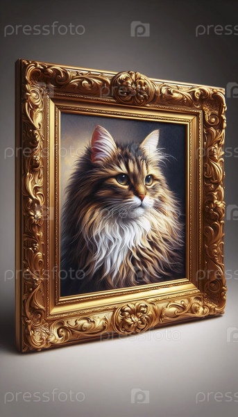 Небольшой портрет кота с золотой рамкой, масляная живопись, Ai generated image