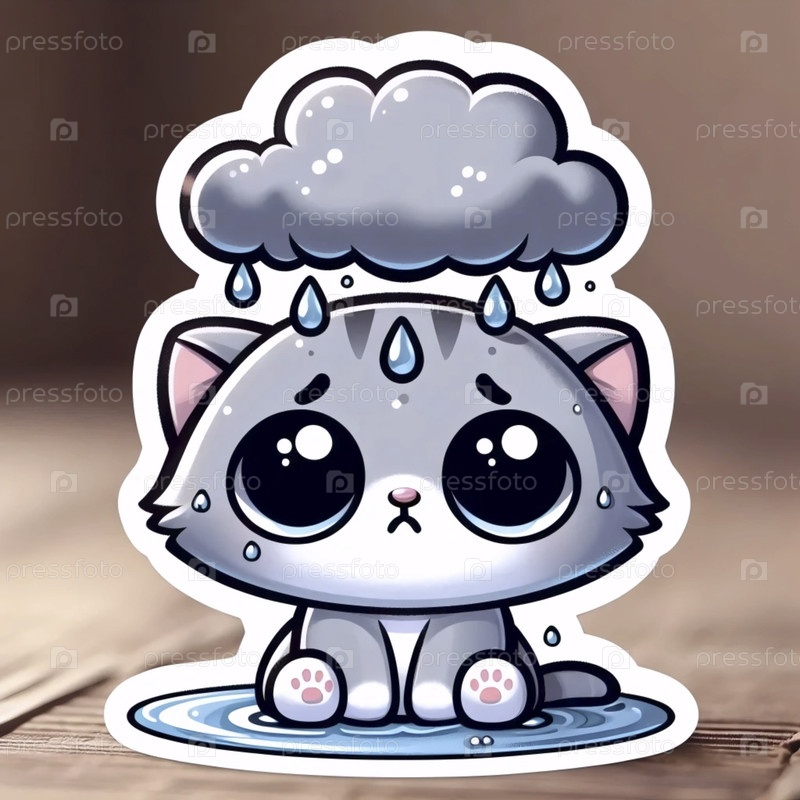 Печальный кот под наклейкой дождевых облаков, Ai generated image