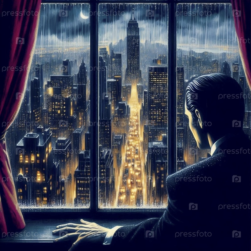 Плакат в живописном стиле из дождливого черного городского пейзажа, Ai generated image