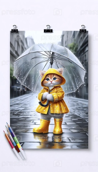 Котенок в дождевом пальто под плакатом зонтика, Ai generated image