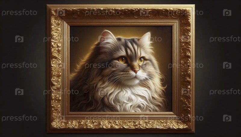 Небольшой портрет кота с золотой рамкой, масляная живопись, Ai generated image