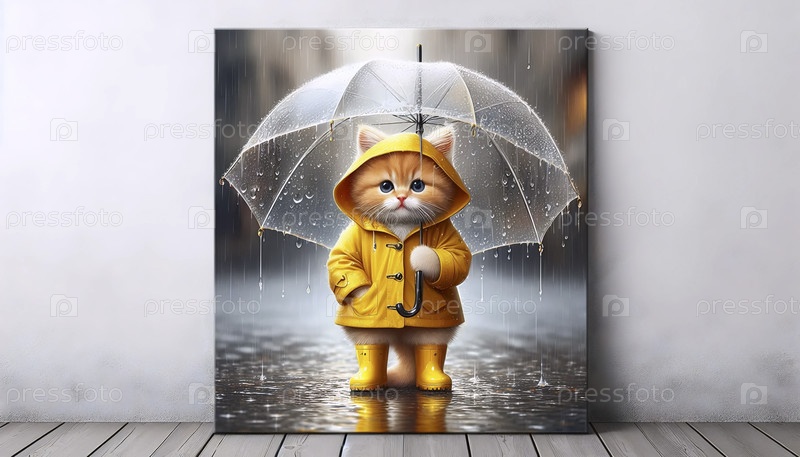 Котенок в дождевом пальто под плакатом зонтика, Ai generated image