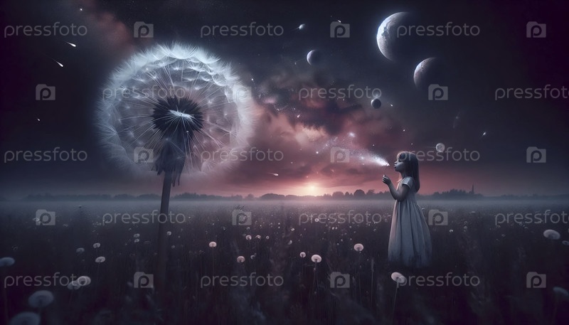 Девочка, выпускающая желание огурца в космический ветер, Ai generated image